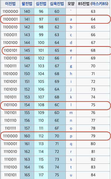 | 이진수 | 01100001 | 01110000 | 01110000 | 01101100 | 01100101 |