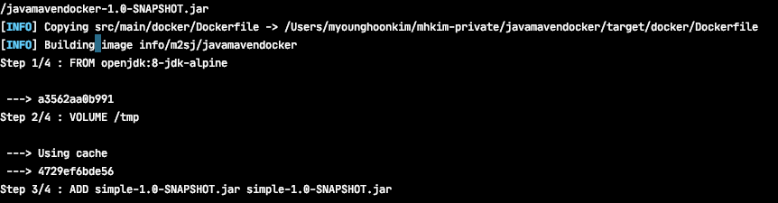 이제 maven 명령어로 jar 파일을 생성하고 Docker Image를 생성하겠습니다. 아래 명령어를 실행합니다.