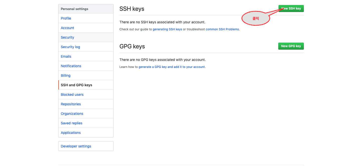 github에 로그인 후 해당 URL로 이동 https://github.com/settings/keys