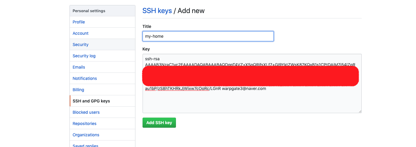 아래에 my_github.pub 의 내용을 cat 명령어로 확인한다. ssh-rsa 부터 메일 계정까지 전부 Key 부분에 붙혀넣는다.