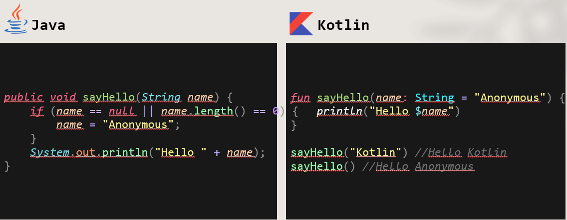 전달값이 null일 경우 default 값을 할당해주는 기능은 다른 언어에서 많이 지원한다. 자바에는 존재하지 않지만 코틀린에서는 아래와 같이 default 값을 설정할 수 있다.
