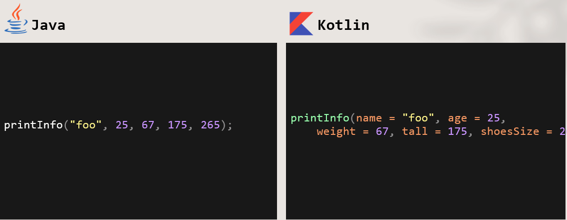 메서드의 인수가 많을 경우 해당 인수의 순서나 의미를 착각하기 쉽다. 물론 IDE에서의 지원 기능을 통해 확인 가능하지만 그걸 배제하고 아래 코드만 봤을때 코틀린의 가독성이 훨씬 좋은 것을 확인할 수 있다. 물론 예제에서 메서드에 파라메터 값이 너무 많기는 하다. 저럴 경우 DTO 클래스를 이용하는게 올바른 코딩일 것이다.