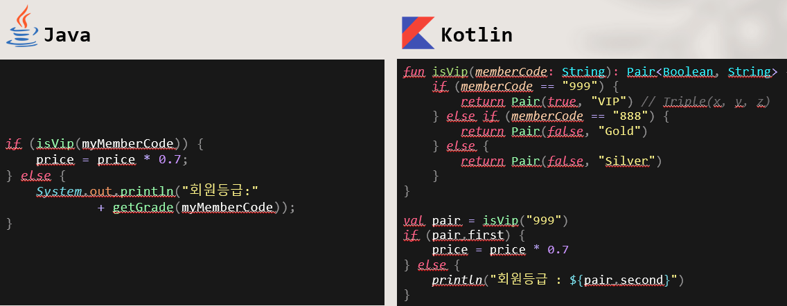 true,false 제어 조건을 확인함과 동시에 해당하는 값을 확인하고 싶을 때 유용하다. 그래서 짧지 않은 개발 경력 기간동안 개발을 하면서 이와 같은 필요를 느낀 경우가 제법 있는 것 같다. 코틀린에서는 Pair , Triple 과 같은 자료형을 통해 해결할 수 있다. 물론 기본적으로 제어와 조회의 로직을 한 개의 함수에 포함시키는것은 좋은 코드는 아니다.
