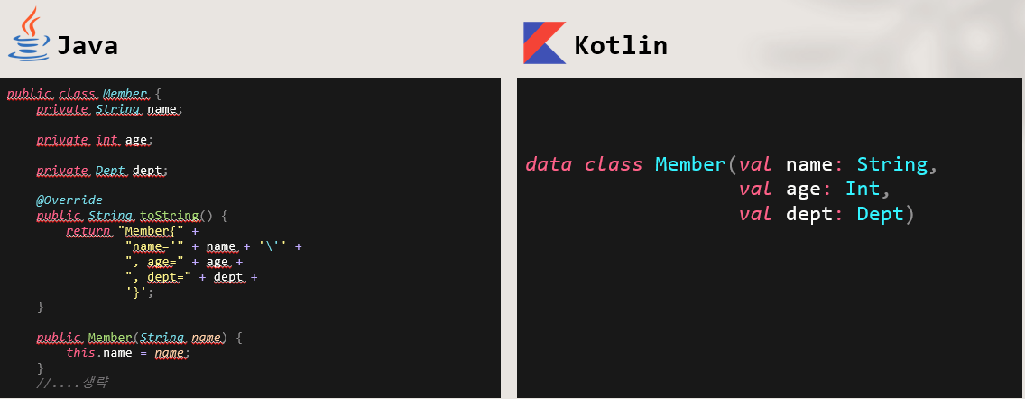 자바에서 데이터 캡슐화 원칙에 의해서 멤버 필드에 접근을 위해서 관례적으로 setter getter 메서드를 생성해줘야 된다. getter setter 뿐만 아니라 생성자와 같은 필수적인 코드가 들어가는데 반복적이고 거추장스럽다. 물론 lombok 과 같은 라이브러리를 이용하면 생략할 수 있지만 코틀린은 언어 차원에서 불필요하고 반복적인 코드들을 제거했다. 아래 왼쪽의 자바 코드는 일부 생략된 부분이 있는데 반면에 코틀린 코드는 정말 Simple 한걸 확인할 수 있다.