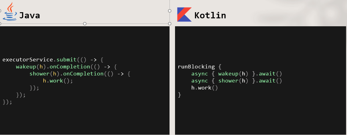 왼쪽은 비동기 처리를 위해 callback 메서드를 이용한 자바 코드이다. callback 패턴을 말할 때 꼬리표처럼 따라오는 callback 헬(류의 파동권 그림은 너무 유명하다.) 에 대한 이야기는 많다. 물론 Promise 패턴을 이용해 좀더 나은 코드를 작성할 수 있지만 코틀린에서는 Coroutine 을 이용해 좋은 성능과 가독성 높은 코드를 작성할 수 있다. 코루틴은 단순한 내용은 아니니 한 번 찾아 보기를 권한다.