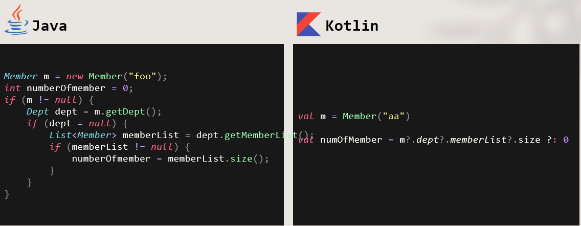 최신 Javascript 에도 포함된 null 체크 제어문이다. 방금전 예시와 같이 개발하면서 정말 많이 느꼈던 부분인데 코틀린에서는 DTO 에 Nest 된 DTO 에 null 체크를 아주 간단하게 처리할수 있다. 왼쪽 자바코드에 비해 코틀린 코드는 정말 간결하고 가독성이 좋다.