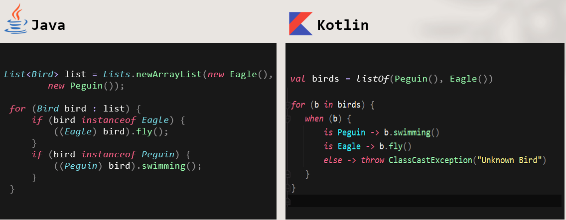 인터페이스를 받아 각 각 상속받는 객체들의 특성 메서드를 호출하기 위해서 자바에서는 아래와 같이 객체 확인이후 객체를 캐스팅해야된다. 코틀린에서는 WHEN 절을 통해 체크후 바로 캐스팅을 암묵적으로 해준다. 아마 타입체크 후에는 반드시 해당 객체로서 이용할 것이기에 언어 내부적으로 캐스팅 작업을 생략한다.