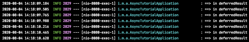DefferedResult 를 이용한 URI 호출 역시 Callable 과 마찬가지로 페이지 요청마다 로그가 출력되는걸 확인할 수 있다.
