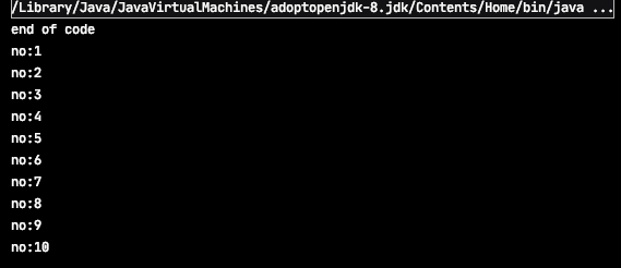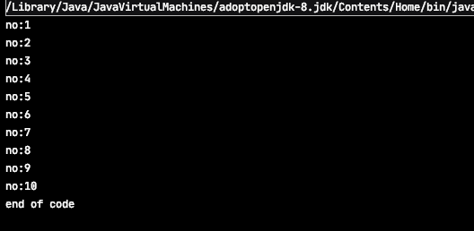 1부터 10까지 잘 출력되고 마지막에 "end of code" 까지 잘 출력이 됐다. 잘 동작하는데.... 뭔가 이상한 느낌이 든다.