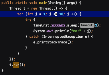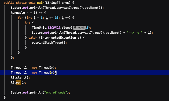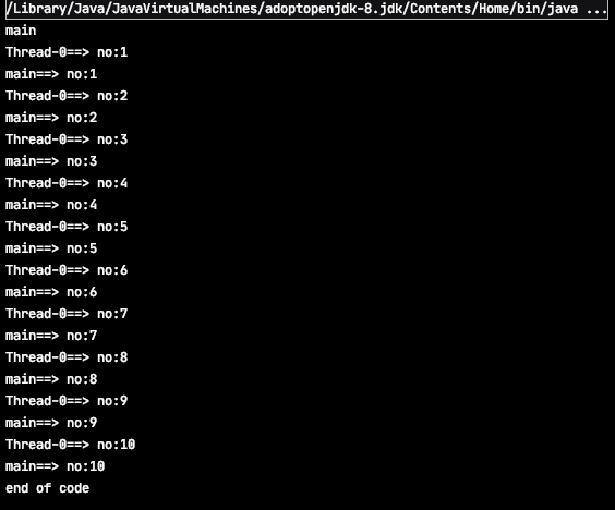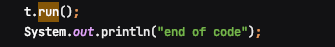 메인 메서드의 쓰레드명이 같다는걸 알수 있다. 결국 run 메서드를 실행하면 현재 실행하고 있는 메인함수의 쓰레드 위에서 동작하게 된다. 대부분 쓰레드를 이용하는 경우는 병렬처리를 위함인데 메인 쓰레드에서 동작하기 때문에 마지막 "end of code" 라인은 run으로 실행시킨 쓰레드가 종료되어야 출력되는 것이다.
