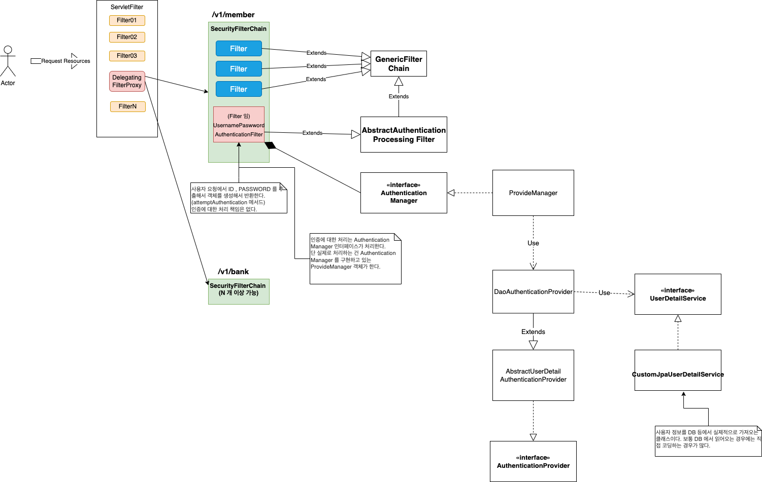 그렇게 웹애플리케이션 만들 수 있게 도와주는 스프링이지만 보안을 담당하는 스프링 시큐리티는 볼때마다 이렇게 복잡해야 돼!? 라는 생각이 자주 든다. 조금 이해를 돕기 위해 기본적인 스프링 시큐리티 클래스 다이어그램을 작성해봤다.