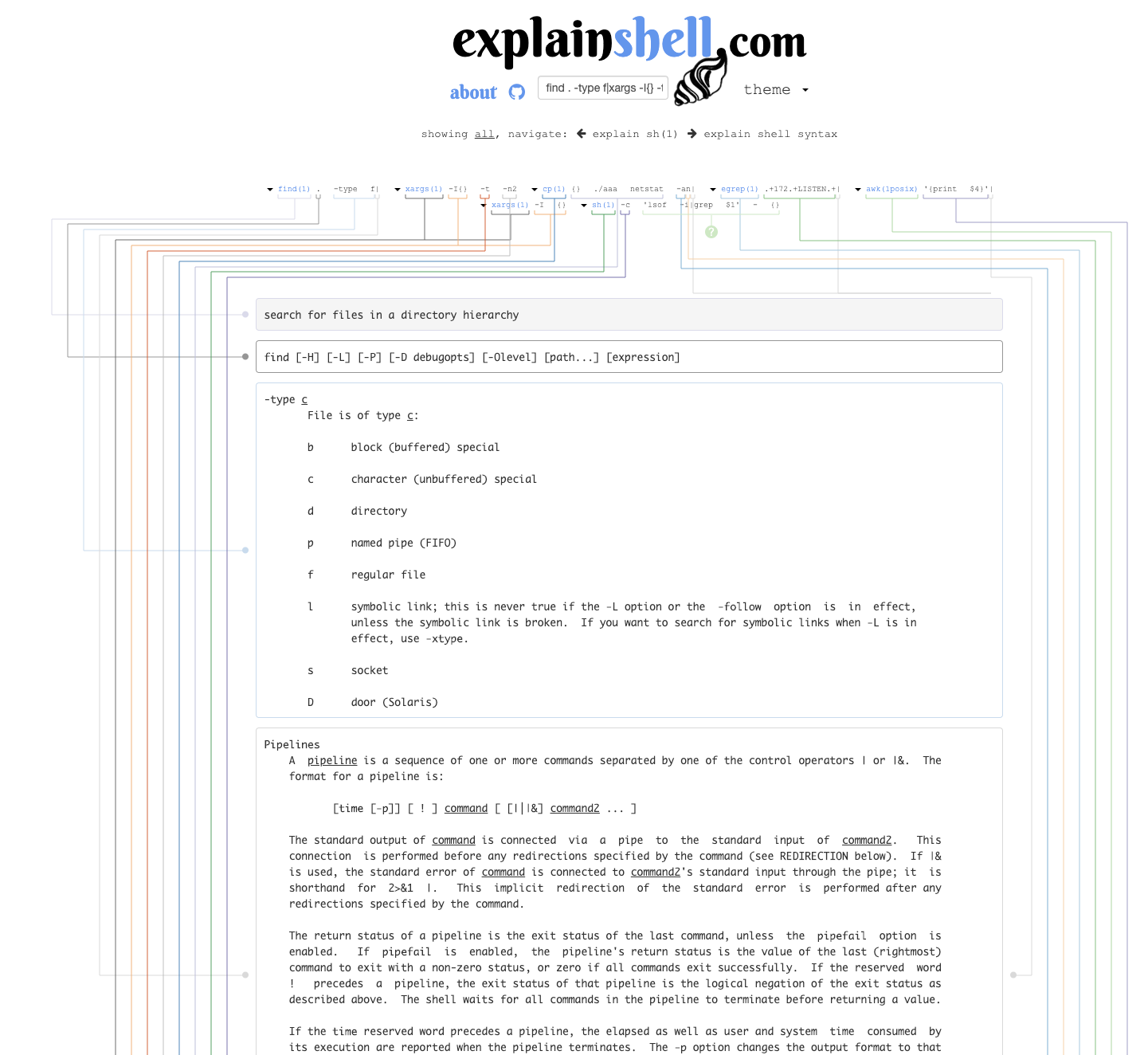 explainshell.com 이라는 사이트가 있습니다. 리눅스 터미널 명령어를 구조적, 시각적으로 해석해서 이해를 쉽게하기 위해 도와주는 사이트입니다. 예를 들어 아래와 같이 복잡하고 긴 명령어를 해석할 수 있습니다.