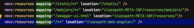 URL Mapping 관련해서 처리할 때 아래와 같이 전체를 뜻하는 /** 맨 위에서 선언하면 아래 항목은 모두 무시 된다. 정말 사소한건데 인식하지 못하면 엄청난 삽질을 만든다.(괜한 설정만 계속 변경함;;)